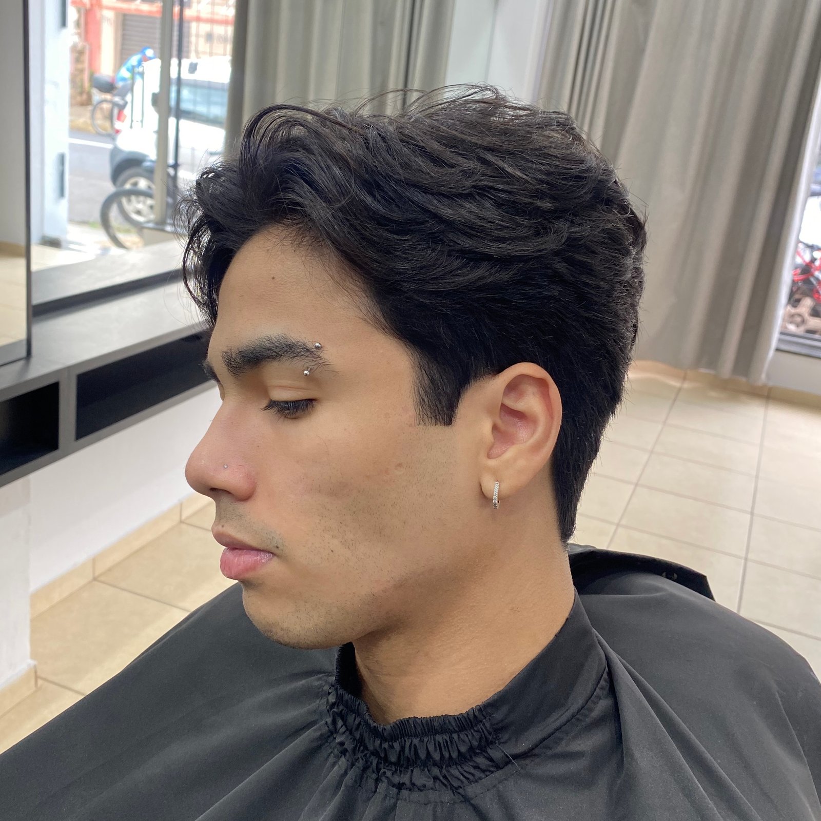 Corte de cabelo com acabamento preciso e modelagem de sobrancelhas, proporcionando um visual limpo e harmonioso.